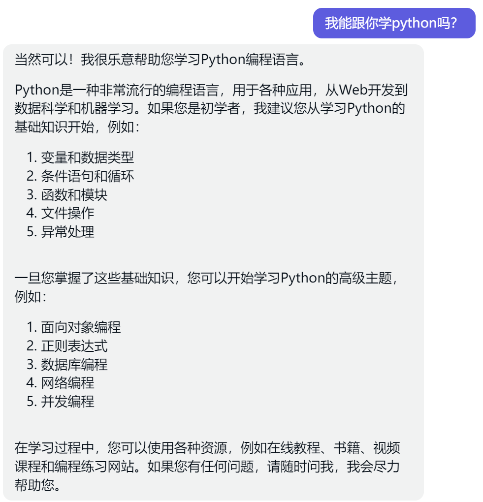 首先我礼貌性的问了一下ChatGPT是否能帮我学习Python,发送如下文本: