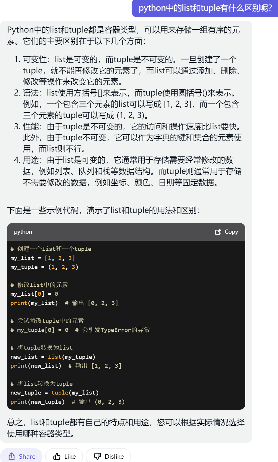 ChatGPT 生成了一个完整且易于理解的答案,解释 list 和 tuple 之间的区别以及使用场景,同时还给出了详细的示例代码帮助你从代码实践中去理解: