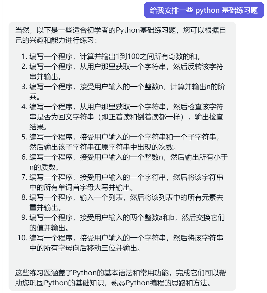 如果你对Python的概念学习的差不多了,可以找ChatGPT要一些练习题,并且它还会帮你批改作业!