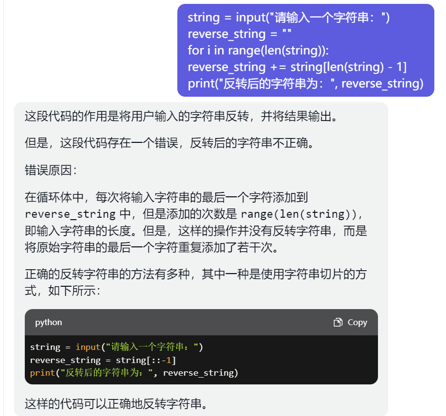 print("反转后的字符串为:", reverse_string)ChatGPT直接发现了我的代码错误!并且告诉了我正确写法。