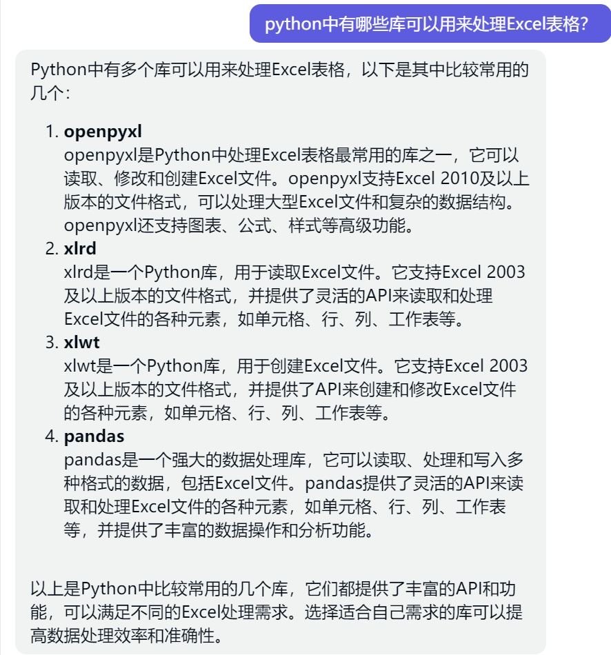ChatGPT给我推荐了4个流行的Excel处理库,并且讲解了各自的优缺点以及使用场景。