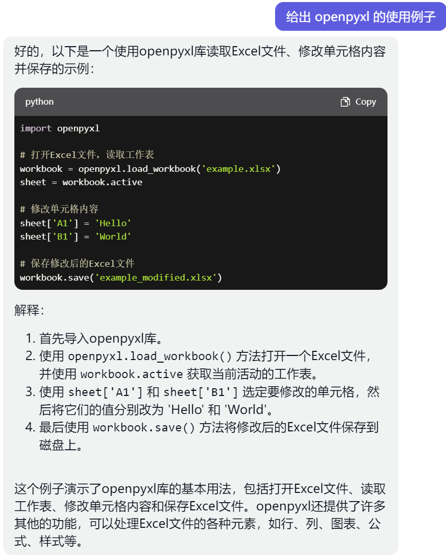 我更进一步的要求给我其中的openpyxl库处理Excel的例子,ChatGPT给我了一个基本使用代码。