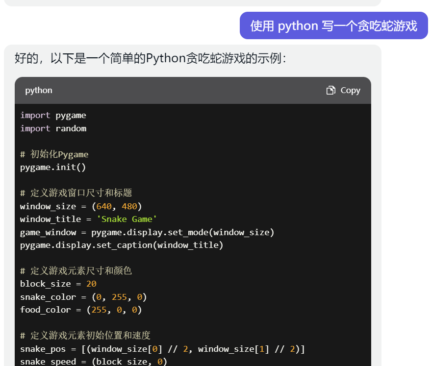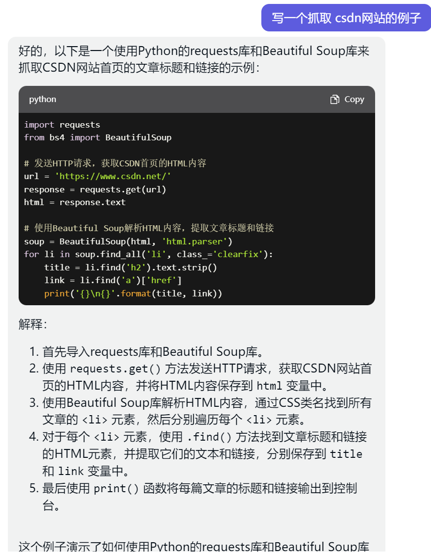 ChatGPT立马就把抓取网页的代码写好了。因为我这里要求的是一个例子,所以给出的代码也比较简单,作为初学者已经够用了。
