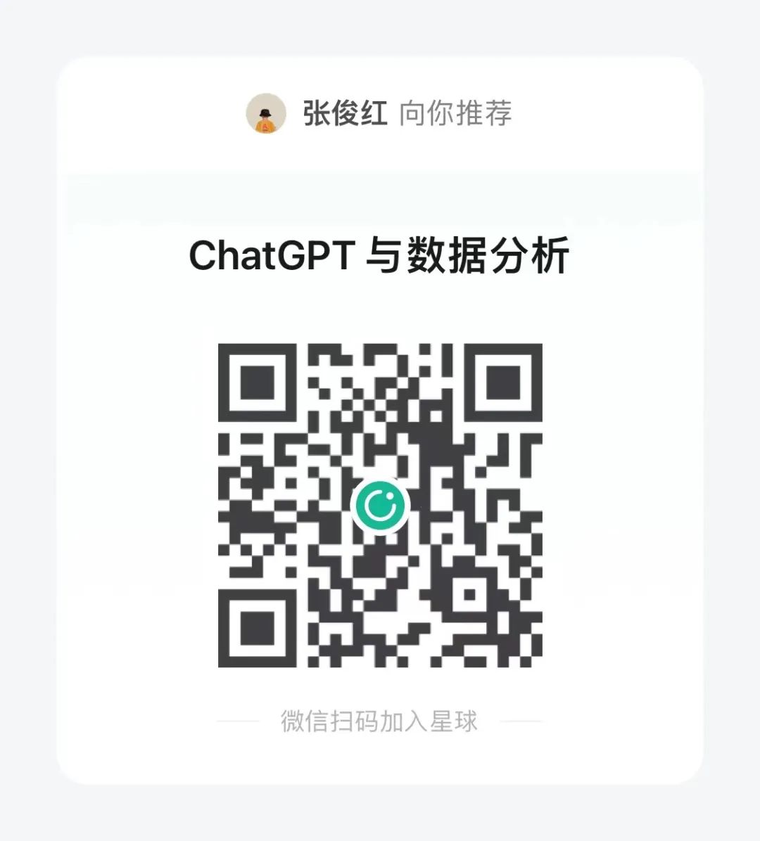 我创建的「ChatGPT与数据分析」知识星球,主要分享如何在数据分析工作中使用ChatGPT,感兴趣的小伙伴可以了解一下: