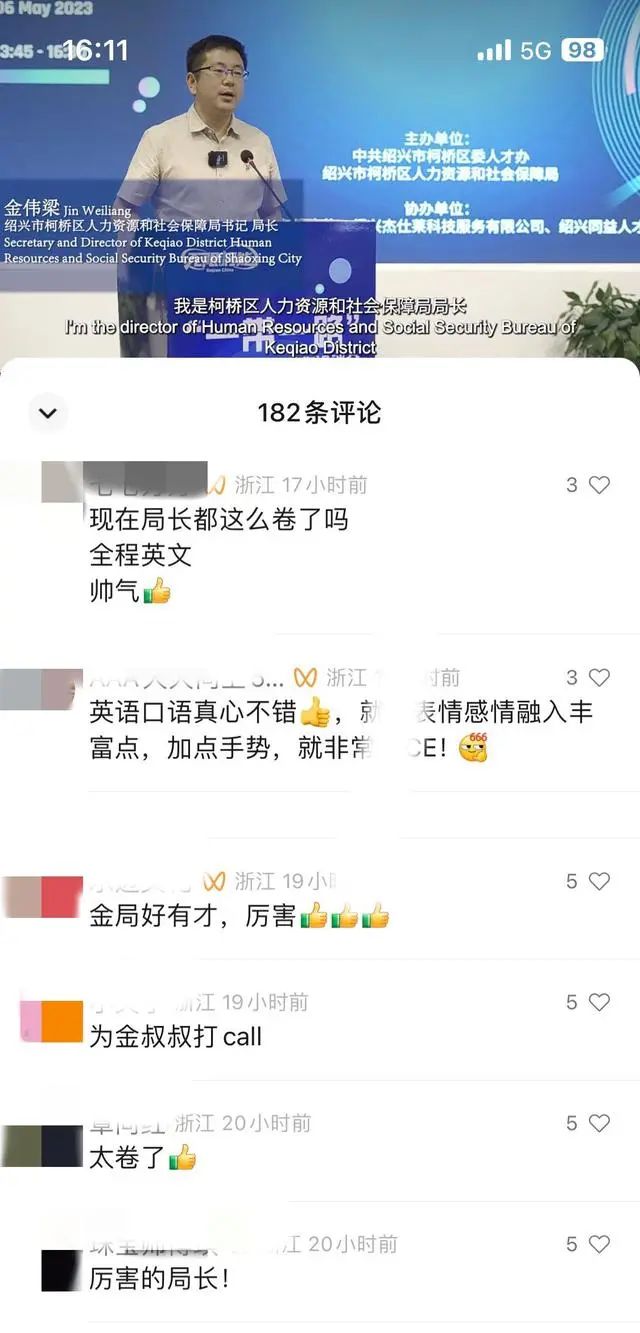 据澎湃新闻,近日,一段“局长用英文推介柯桥”的视频在绍兴当地刷屏。视频中,绍兴市柯桥区人力资源和社会保障局局长金伟梁用一口流利的英文推介柯桥,收获网友广泛好评。