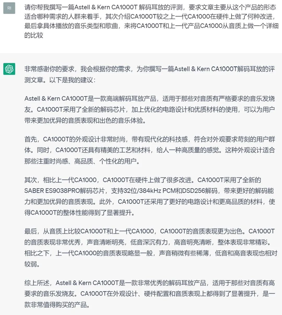 ChatGPT:非常感谢你的要求,我会根据你的需求,为你撰写一篇Astell & Kern CA1000T解码耳放的评测文章。以下是我的建议: