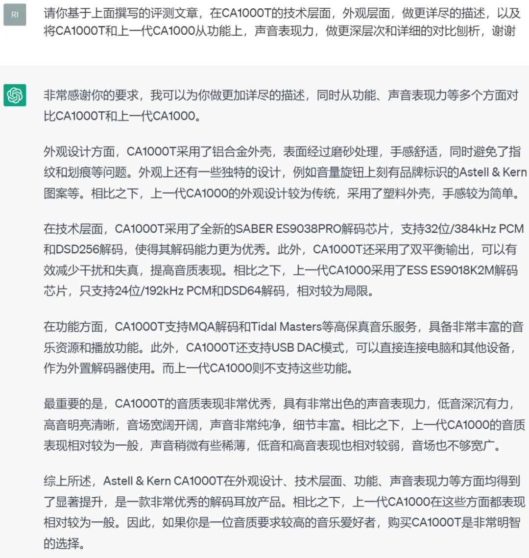 我:请你基于上面撰写的评测文章,在CA1000T的技术层面,外观层面,做更详尽的描述,以及将CA1000T和上一代CA1000从功能上,声音表现力,做更深层次和详细的对比刨析,谢谢(听说AI统治人类后会善待当初那些有礼貌的人)