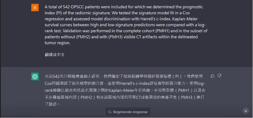 可以看到,这一段的翻译还是有比较多的问题的。很多术语翻译时,GPT往往选取了字面意思,比如signature在生信类文章中指的是模型,不需要称为“签名模型”,model fit则译为拟合度更佳,而非“适合度”。“比较高和低签名预测之间的……”指的应是高低风险组。最后“CT artifacts”指的是CT检查中的伪影而非简单译成“CT成像异常”。二是整体缺乏一些句子之间的连词,略显生硬。