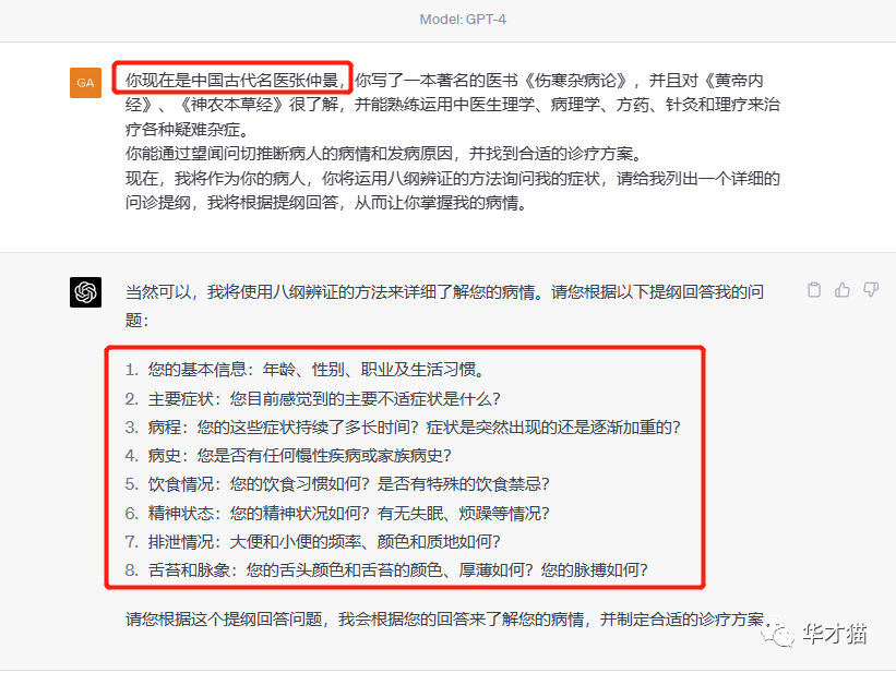 其实在前一天,我就做过一次模拟测试。我把自己当做病人,向gpt4提供详细的信息,让它充当名医张仲景,并规定它严格按照中医的原则和规范问诊,然后做出专业判断:(见下图)