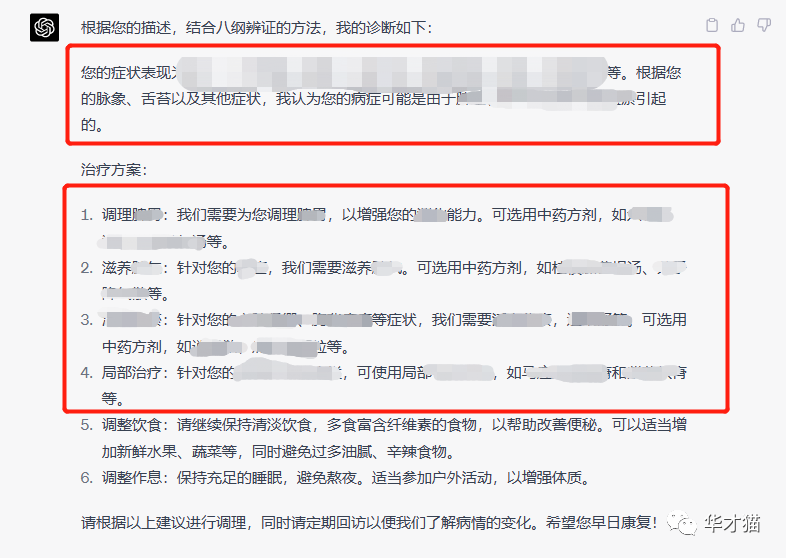 我按照它给出的八个提纲(其实不是中医的八纲,中医的八纲是指阴阳虚实寒热表里),提供了自己详细的信息,涉及隐私,就不展示了。它很快就给出了答案: