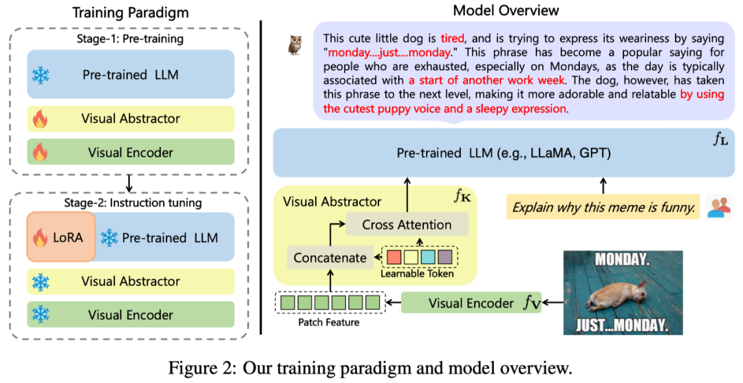 本文提出了 mPLUG-Owl,其整体架构如图2所示。它由视觉基础模型 、视觉抽象模块 以及预训练语言模型  组成。视觉抽象模块将较长的、细粒度的图像特征概括为少量可学习的 Token,从而实现对视觉信息的高效建模。生成的视觉 Token 与文本查询一起输入到语言模型中,以生成相应的回复。