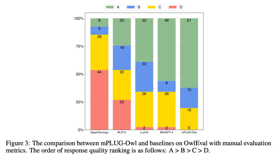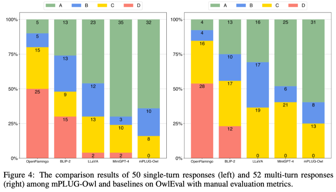 如图3所示,本文在构建的多模态测评集 OwlEval 上对 mPLUG-Owl 进行了人工评估。评价结果分为四个等级 A-D,代表对应的生成质量依次递减。从测评结果中可以看出,mPLUG-Owl 取得了最佳的结果。为了分别探究 mPLUG-Owl 在单轮对话和多轮对话上的性能,本文还从 OwlEval 中单独抽出了一些单轮对话和一些多轮对话,分别进行人工评估。结果如图4所示。可以发现,mPLUG-Owl 具有较强的多轮对话能力。消融实验