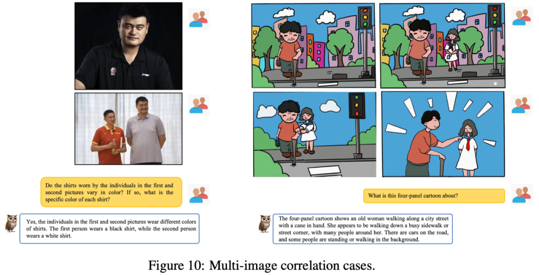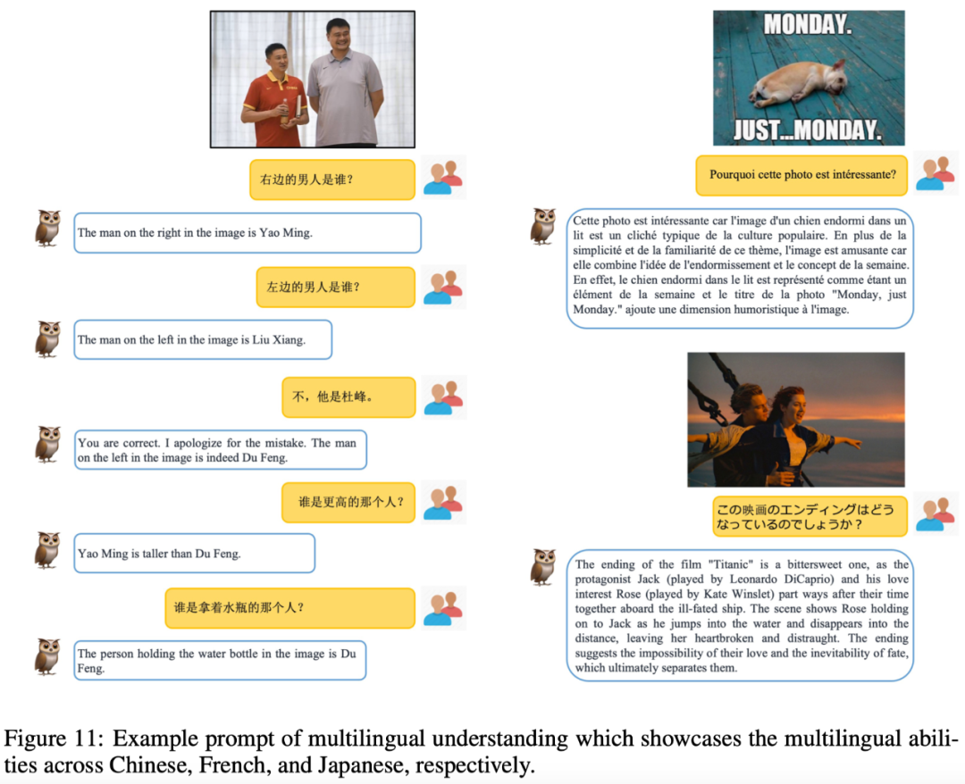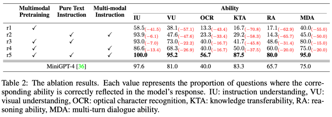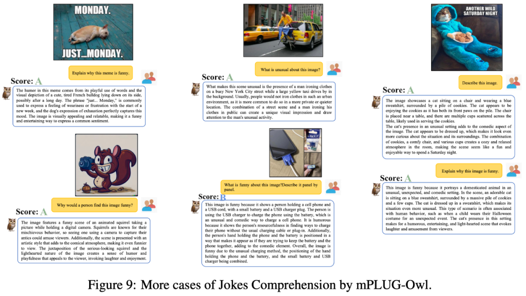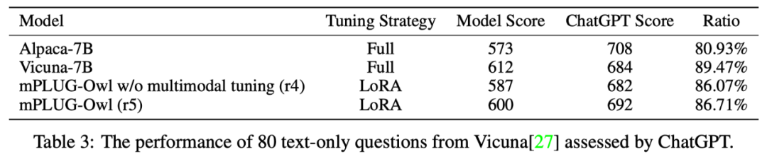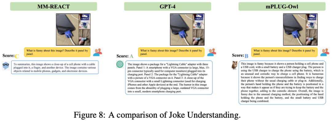 为了探究训练策略与指令数据的使用对模型结果的影响,本文还展示了消融实验的结果,如表2所示。此外,本文还发现了一个有趣的现象:多模态数据的学习可以提高模型的文本单模态能力。正如表3所示,使用ChatGPT对生成结果进行评分发现,仅调整LoRA参数的mPLUG-Owl在纯文本生成能力上击败了全参数调整的Alpaca。从图6中可以发现,mPLUG-Owl有较强的多轮对话能力。从图7中可以发现,mPLUG-Owl还具有很强的推理能力。尽管mPLUG-Owl已具有较强的图文理解能力,但和GPT-4相比仍有一些差距。如图8所示,mPLUG-Owl虽然已经正确理解了笑点,但错误地将VGA插头识别为了USB插头。如图10所示,虽然在训练阶段并没有进行多图关联数据的训练。mPLUG-Owl展现出了一定的多图关联能力。如图11所示,尽管mPLUG-Owl在训练阶段仅接触了英文数据,但其展现出了有趣的多语言能力。这可能是因为mPLUG-Owl中的语言模块采用了支持多语言的LLaMa,从而出现了这一现象。