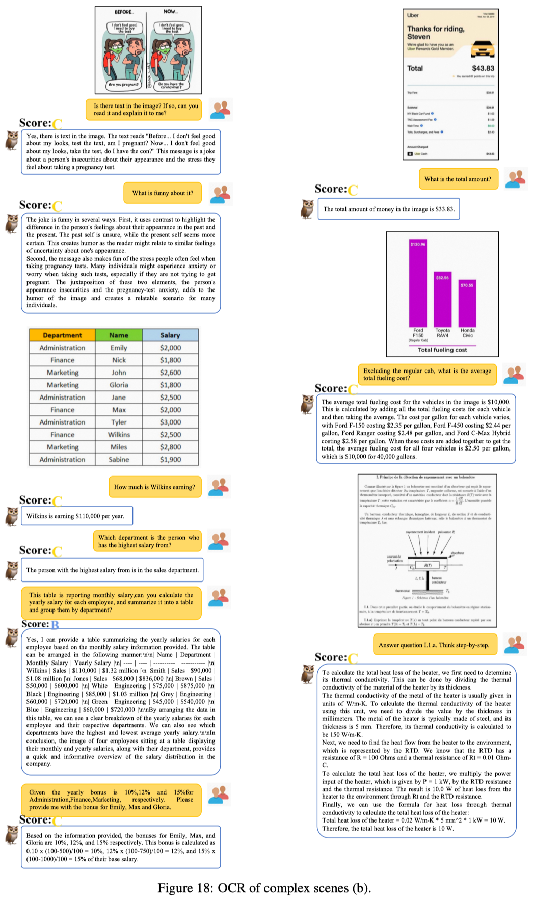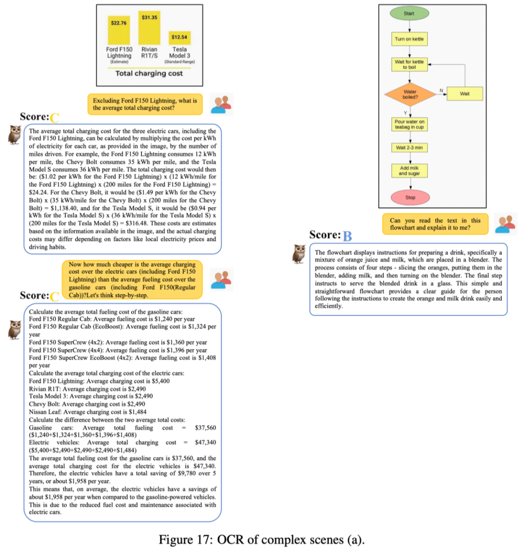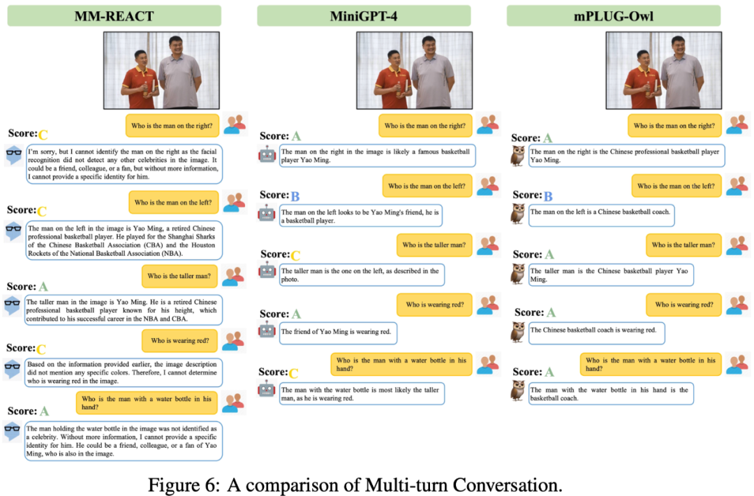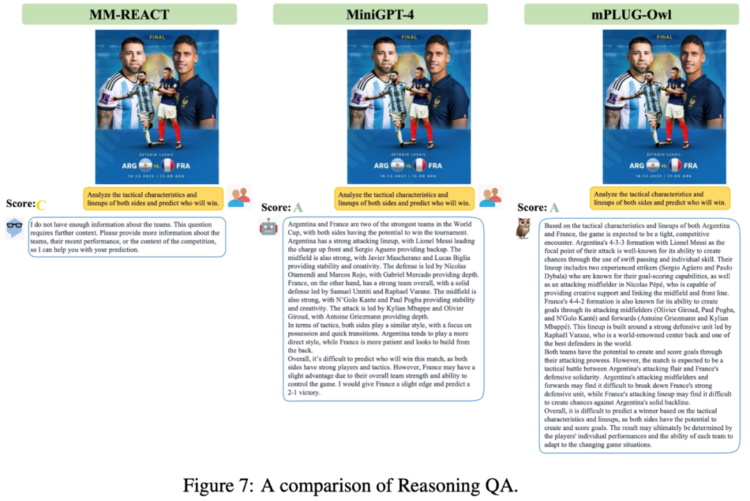 为了探究训练策略与指令数据的使用对模型结果的影响,本文还展示了消融实验的结果,如表2所示。此外,本文还发现了一个有趣的现象:多模态数据的学习可以提高模型的文本单模态能力。正如表3所示,使用ChatGPT对生成结果进行评分发现,仅调整LoRA参数的mPLUG-Owl在纯文本生成能力上击败了全参数调整的Alpaca。从图6中可以发现,mPLUG-Owl有较强的多轮对话能力。从图7中可以发现,mPLUG-Owl还具有很强的推理能力。尽管mPLUG-Owl已具有较强的图文理解能力,但和GPT-4相比仍有一些差距。如图8所示,mPLUG-Owl虽然已经正确理解了笑点,但错误地将VGA插头识别为了USB插头。如图10所示,虽然在训练阶段并没有进行多图关联数据的训练。mPLUG-Owl展现出了一定的多图关联能力。如图11所示,尽管mPLUG-Owl在训练阶段仅接触了英文数据,但其展现出了有趣的多语言能力。这可能是因为mPLUG-Owl中的语言模块采用了支持多语言的LLaMa,从而出现了这一现象。