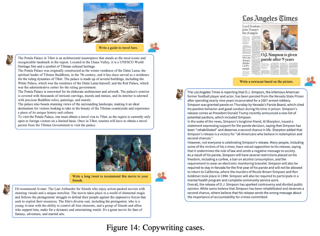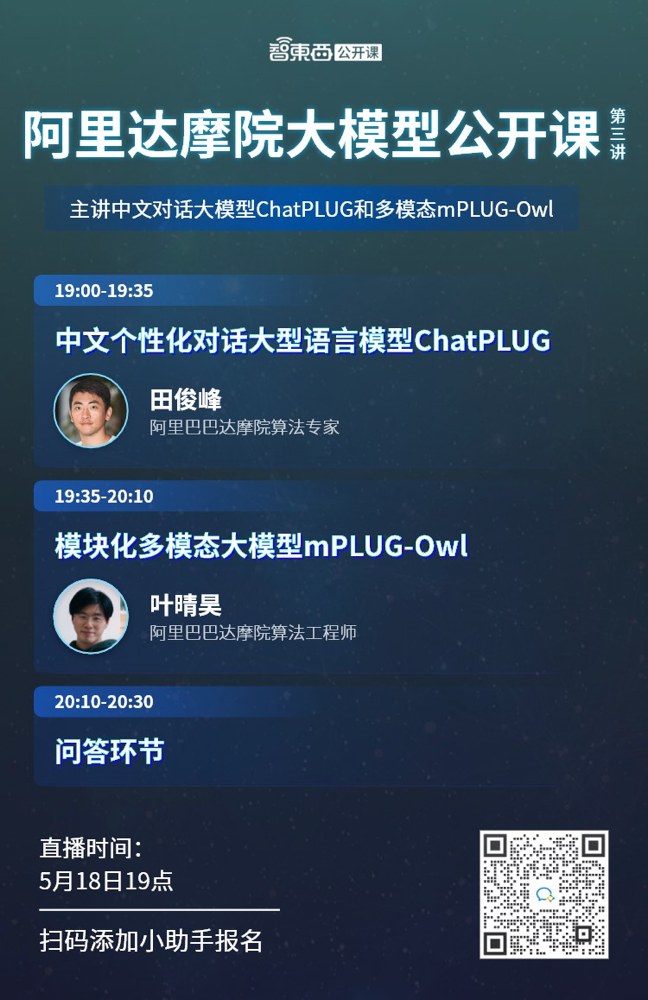 尽管mPLUG-Owl没有在带有标注的文档数据上进行训练,但其仍然展现出了一定的文字识别和文档理解能力。测试结果如图12所示。如图13、14所示,mPLUG-Owl在多模态的开放式结尾续写方面展现出了较强的能力。以下是更多有趣的例子:5月18日晚7点,「阿里达摩院大模型公开课」第3讲上线开讲,阿里巴巴达摩院算法专家、ChatPLUG 核心贡献者田俊峰和阿里巴巴达摩院算法工程师、mPLUG 核心贡献者叶晴昊将参与主讲。两位主讲人将对ChatPLUG 和 mPLUG-Owl 背后的技术细节进行深入剖析。扫码报名!