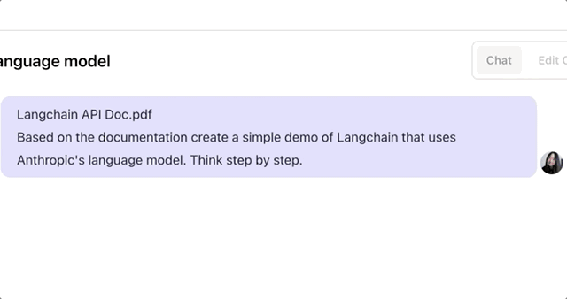 当交给它一个240页的LangChain API报告后,要求它快速给出一个LangChain的demo演示: