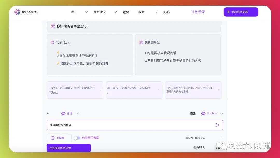 除此之外,TextCortex还提供了一个AI助手——Zeno ChatGPT,它可以在你的命令下帮助你编写任何内容。只需要使用可理解的命令,例如“写一封浪漫的信……”、“产生关于……的想法”、“写一封电子邮件……”等,Zeno就能帮助你完成写作任务。此外,它还提供了一个工具栏,可以快速访问一些常用的功能,例如重写、扩展、总结和文本到语音等,可以让你在写作过程中事半功倍。