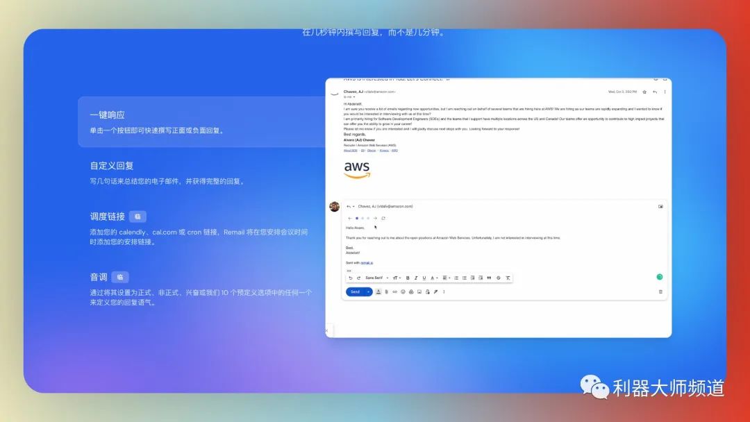 Remail提供了多种高级功能,例如添加您的calendly链接,以便在安排会议时间时自动添加日程安排链接。此外,可以设置回复的语气,例如正式、非正式、兴奋等。它可以理解电子邮件主题,并返回与对话样式和语气相符的相关结果。用户通过使用Remail,可以消除电子邮件写作障碍。