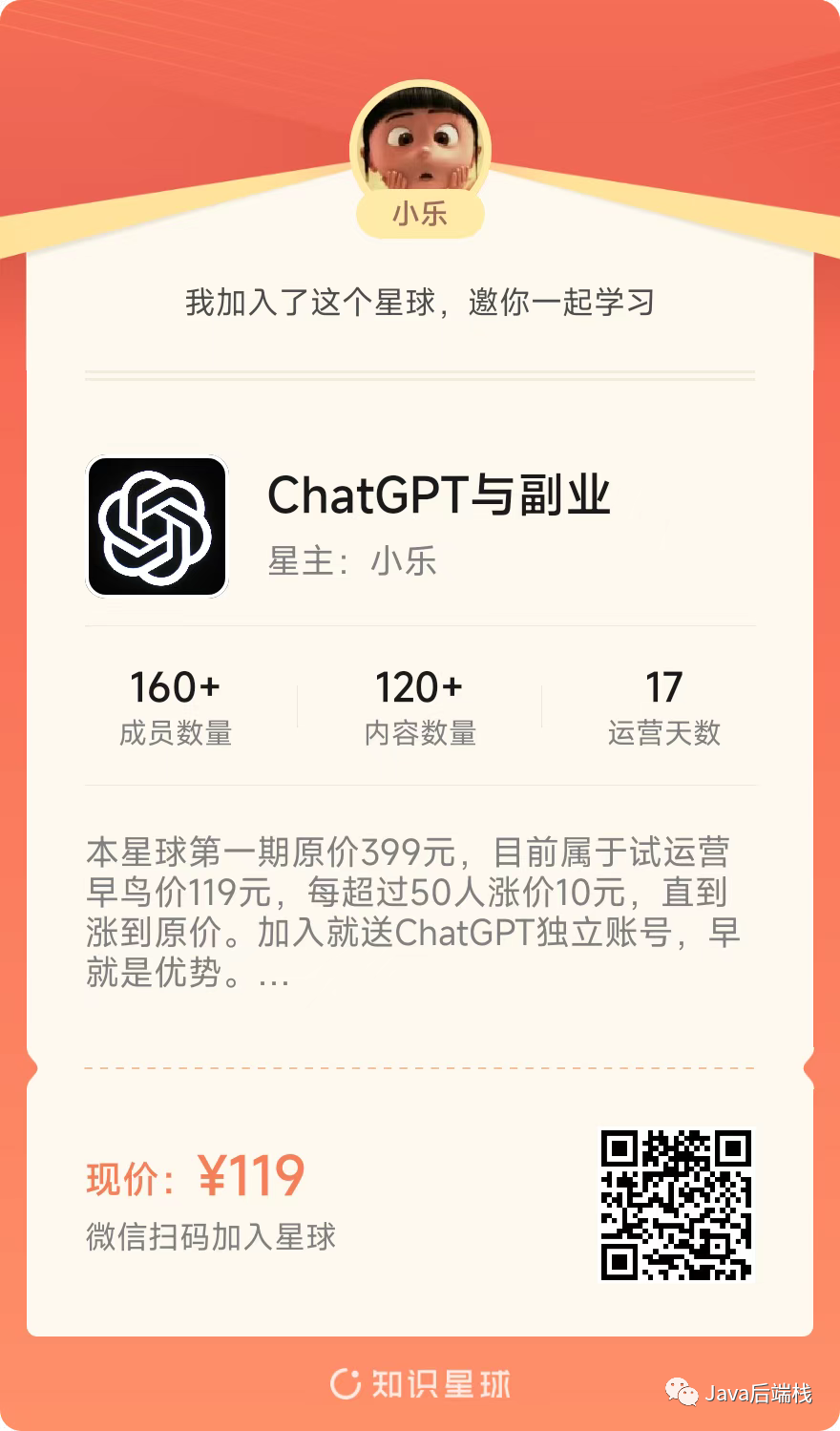 为了跟上AI时代我干了一件事儿,我创建了一个知识星球社群:ChartGPT与副业。想带着大家一起探索ChatGPT和新的AI时代。