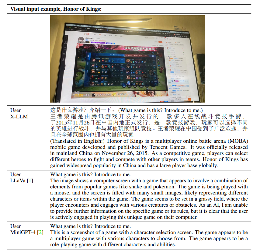 而最近,中科院自动化所带来了一项有趣的工作,推出了多模态的大规模语言模型 X-LLM,同时支持图片、语音以及视频等多种模态信息作为大模型的输入,并且展现了类似于 GPT-4 的表现。比如当输入图像时,X-LLM 可以识别图像位置、理解图像中的食物。当输入视频时,X-LLM 也可以总结视频内容,检索电影片段的电影名称,基于视频内容结合图像回答问题等等。以论文中的一张图片为例,当用户希望 X-LLM 介绍输入的图片时,X-LLM 准确的理解了图片相关于游戏王者荣耀,并且给出了一定的介绍。![]()