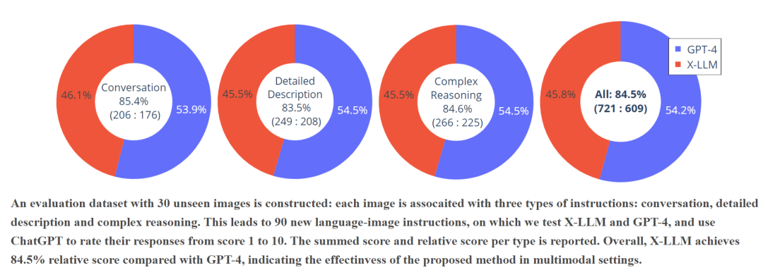 从性能来看,作者团队使用了 30 张模型未见过的图像,每张图像都与相关于对话、详细描述以及推理三类的问题,从而形成了 90 个指令-图像对以测试 X-LLM 与 GPT-4 的表现。可以看到,通过使用 ChatGPT 从 1 到 10 为模型回复进行评分,与 GPT-4 相比 X-LLM 取得了 84.5% 的相对分数,表明了模型在多模态的环境中是有效的。![]()