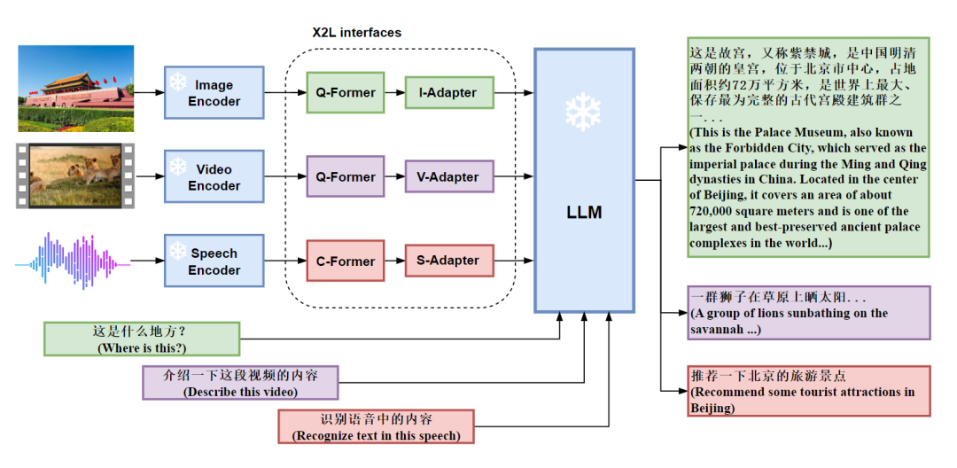 在进入论文之前,首先来想想一个问题,GPT-4 是如何获得其强大的多模态能力的呢?论文作者给出了一个假设:“GPT-4 的多模态能力来源于其更先进,更大的语音模型,即 GPT-4 是用语言的形式表达出了其他模态的内容”。这个假设也就是讲,需要将多模态的数据“对齐”到语言数据之中,然后再投入大模型以获得多模态能力,在这个假设的基础上,作者提出了 X2L 接口,其中 X 意味着多模态数据,而 L 则表示语言,X2L 接口即将多个单模态编码器与一个大规模语言模型(LLM)进行对齐。其中,图像接口 I2L 采用 BLIP-2 中的 Q-Former,视频接口 V2L 复用图像接口的参数,但是考虑了编码后的视频特征,语言接口 S2L 采用 CIF 与 Transformer 结构将语音转换为语言。整个 X-LLM 的训练包含三个阶段,分别是(1)转换多模态信息;(2)将 X2L 对齐到 LLM;(3)将多模态数据整合到 LLM 中。![]()