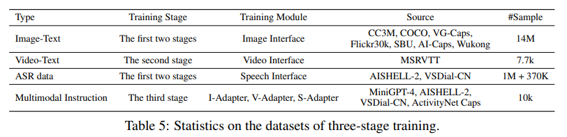 而在第二阶段,Q-Former 的参数来源于 BLIP2 中的 Q-Former 的参数。为了使得 Q-Former 适应中文 LLM,作者们使用了一个总共包括约 1400 万个中文图片-文本对的数据集进行训练,并使用图片中训练好的接口初始化视频中的 Q-Former 和 V-Adapter,最后,使用 ASR 数据训练语音接口,使语音界面的输出与 LLM 对齐。在整个过程中,Encoder 部分与 LLM 部分都不参与训练,只有接口部分进行训练。而最后第三阶段,论文使用多模态联合训练增强 X-LLM 的多模态能力,但是可以看到,在没有进行联合训练时,X-LLM 已经具有了识别多模态的能力,这种能力很有可能是来自于 LLM。而为了进行联合训练,作者构建了一个多模态指令数据集对接口进行微调,包含(1) 图像-文本指令数据,(2)语音-文本指令数据,(3) 视频-文本指令数据以及 (4) 图像-文本-语音指令数据。整个数据集主要来源于 MiniGPT-4(图像,3.5k)、AISHELL-2(语音,2k)以及 ActivityNet(视频,1k)。![]()