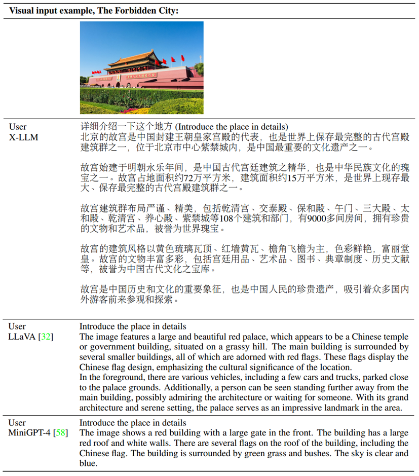 而在实验方面,论文作者开发了一个聊天界面,用以与其他开源的多模态大规模语言模型( LLaVA 与 MiniGPT-4)做对比,整体而言,X-LLM 具备了相当不错的阅读和理解图片的能力,并且可以更好的捕捉其中具有“中国特色”的预料,如下图问答所示,当输入天安门的图片时,X-LLM 准确的识别出了它是北京的故宫,并且给出了一些历史的介绍,而相应 LLaVA 与 MiniGPT-4 仅仅识别出来了中国的宫殿和旗帜,但是并没有提到 Forbidden City。![]()