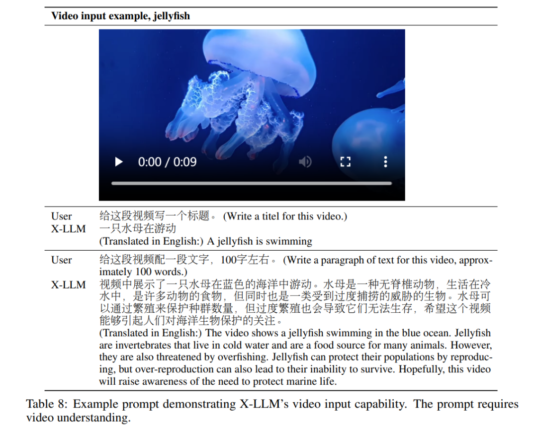 此外,在视频问答方面,X-LLM 也表现得相当不错,对于输入的水母游动的视频,X-LLM 可以颇为准确的为视频做出标题,并配以文字。![]()