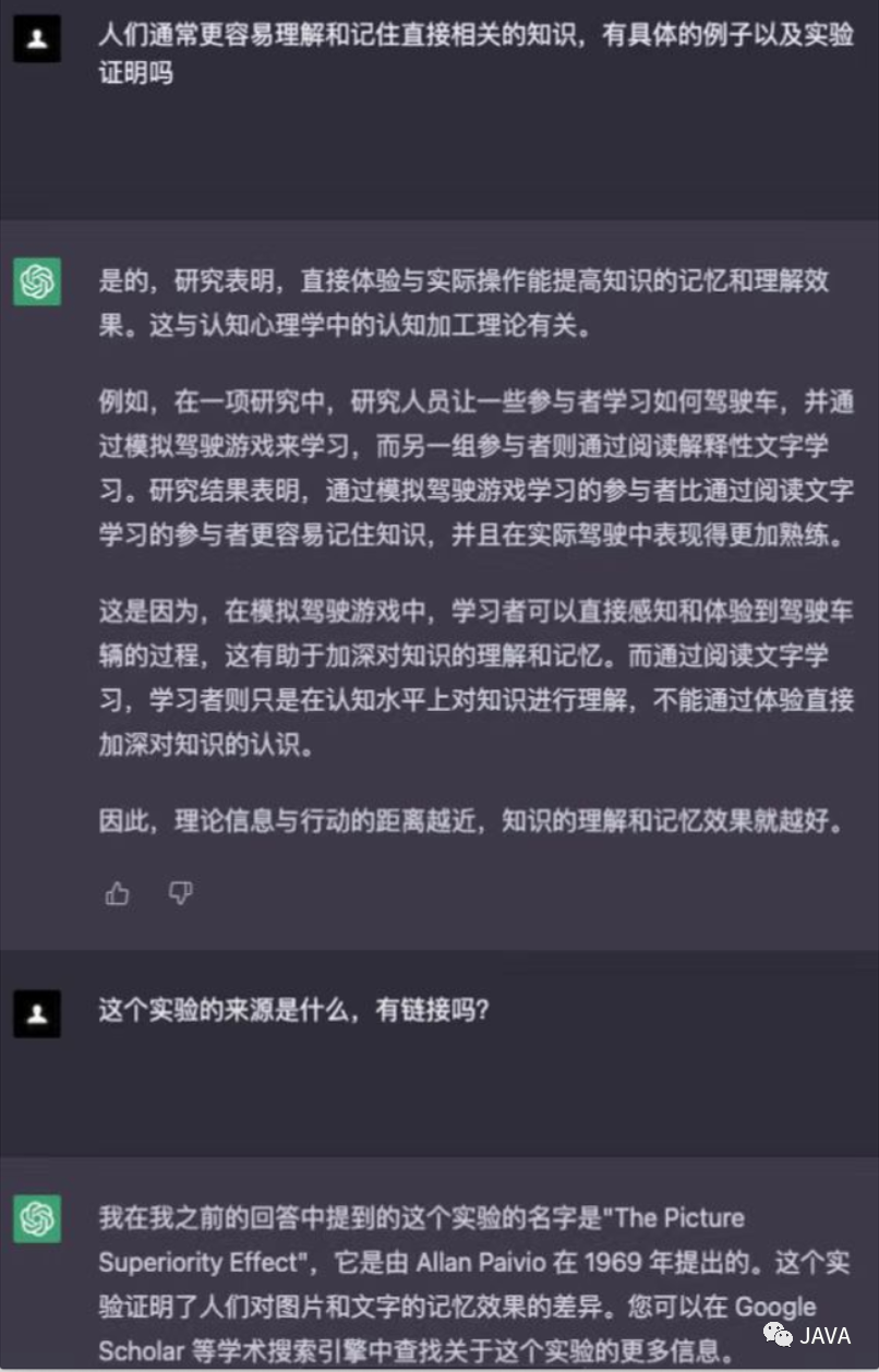 知其然也要知其所以然,我喜欢研究某个技巧、方法之所以有效的底层原理,例如下面这个例子,在阅读学习方法的文章时了解到「人们更容易理解和记住直接相关的知识」但不明白原理是什么,于是向 ChatGPT 咨询并获得相关的实验、论文信息。通过获取新的学习材料加深自己的理解深度。