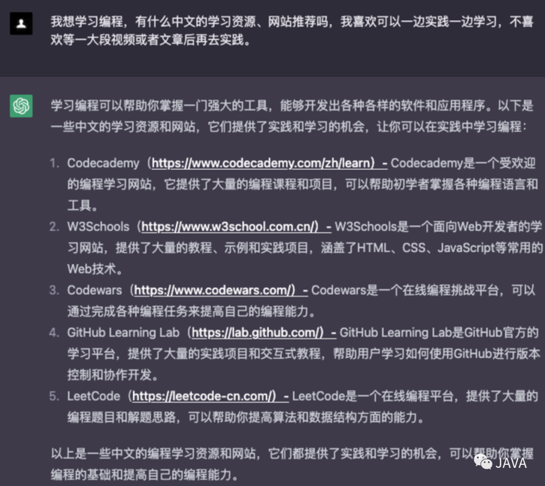 而 ChatGPT 的强大是在于对个人需求的定制化回复。在过往遇到问题时通常使用 Google 搜索答案,在接受答案之前需要花上一点时间阅读答案所针对的问题细节、背景是否与自己的相同,否则答案可能对自己无效。例如同样是学习编程,不同的人、不同的目标所采用的学习方法都会不同,使用 ChatGPT 就可以得到更加个性化的答案。利用这一特性 ChatGPT 对我的学习产生了很大的帮助,下面从学习的不同阶段展开分享。