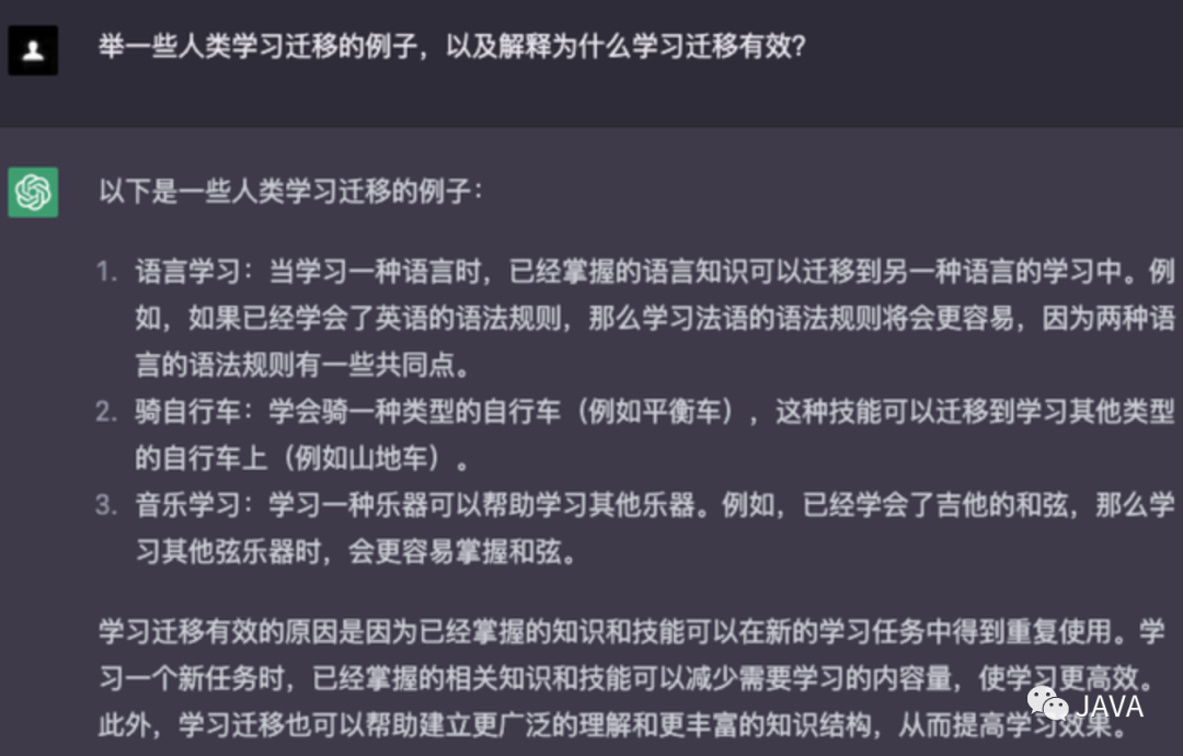 通过查看更多的例子可以帮助我们理解知识,例如在学习「学习迁移」这个概念时,可以向 ChatGPT 获取例子来帮助理解。你可以试着读一下截图中 ChatGPT 提供的例子,是否以从例子中归纳出学习迁移的定义呢?