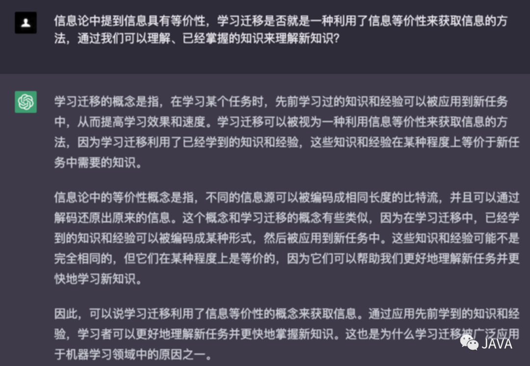 例如在学习了信息论中「信息的等价性」原理后,似乎察觉到它和前面提到的「学习迁移」之间的联系,此时我会向 ChatGPT 咨询以验证自己的想法。