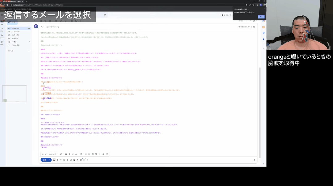 在实验中,被试者带上EEG设备后,首先在前5封邮件中,选择了自己要回复的邮件。小声说「紫罗兰」,获得对应的脑电波。