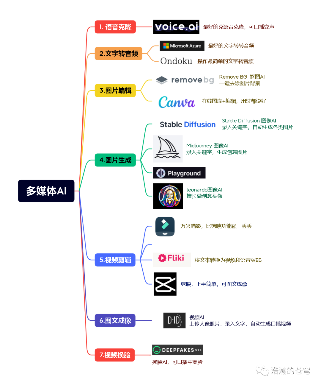 答:我给你一个我做的思维导图,列出了常见的细分领域中,排名数一数二的 AI 工具。如果 AI 工具是一个班级,ChatGPT 就是现任班长。