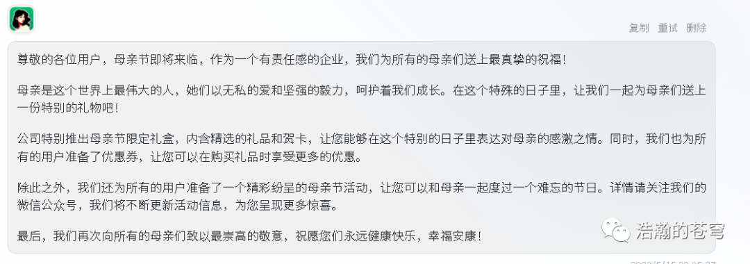 注意我给出的提示,两次略有不同,ChatGPT 给了不同的内容。