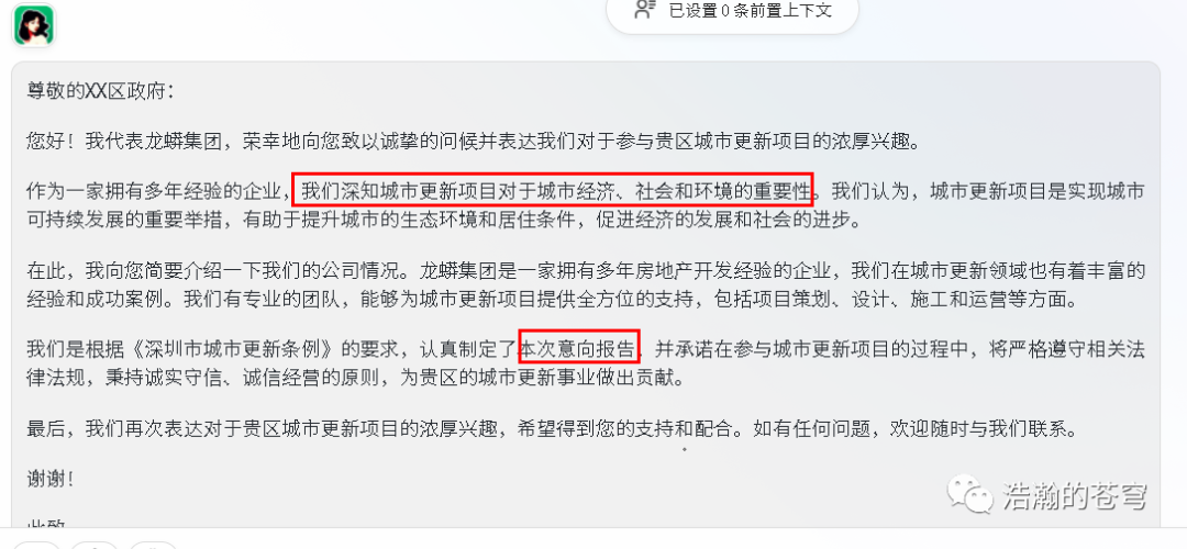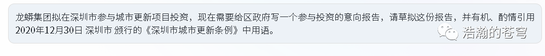 大家注意,“意向报告”几个字,在我给出的提示词中并没有包含,但在我要求 chatgpt 引用的深圳市旧城改造文件中是存在的。ChatGPT 根据项目进展,智能地引用了这个用语。