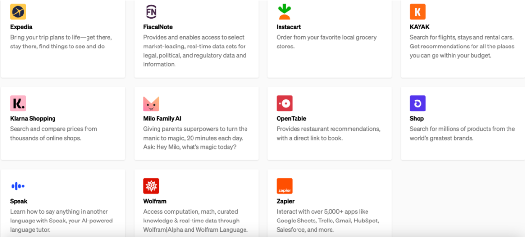 目前,ChatGPT开放了由12个第三方发布的11个平台插件,包括智能旅行助手Expedia、智能财务票据助手FiscalNote、智能购物助手Instacart。