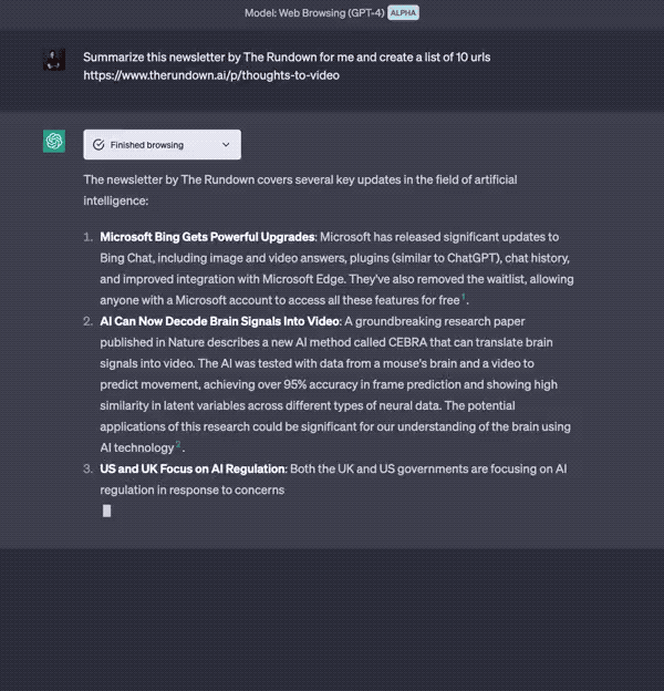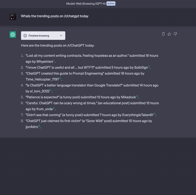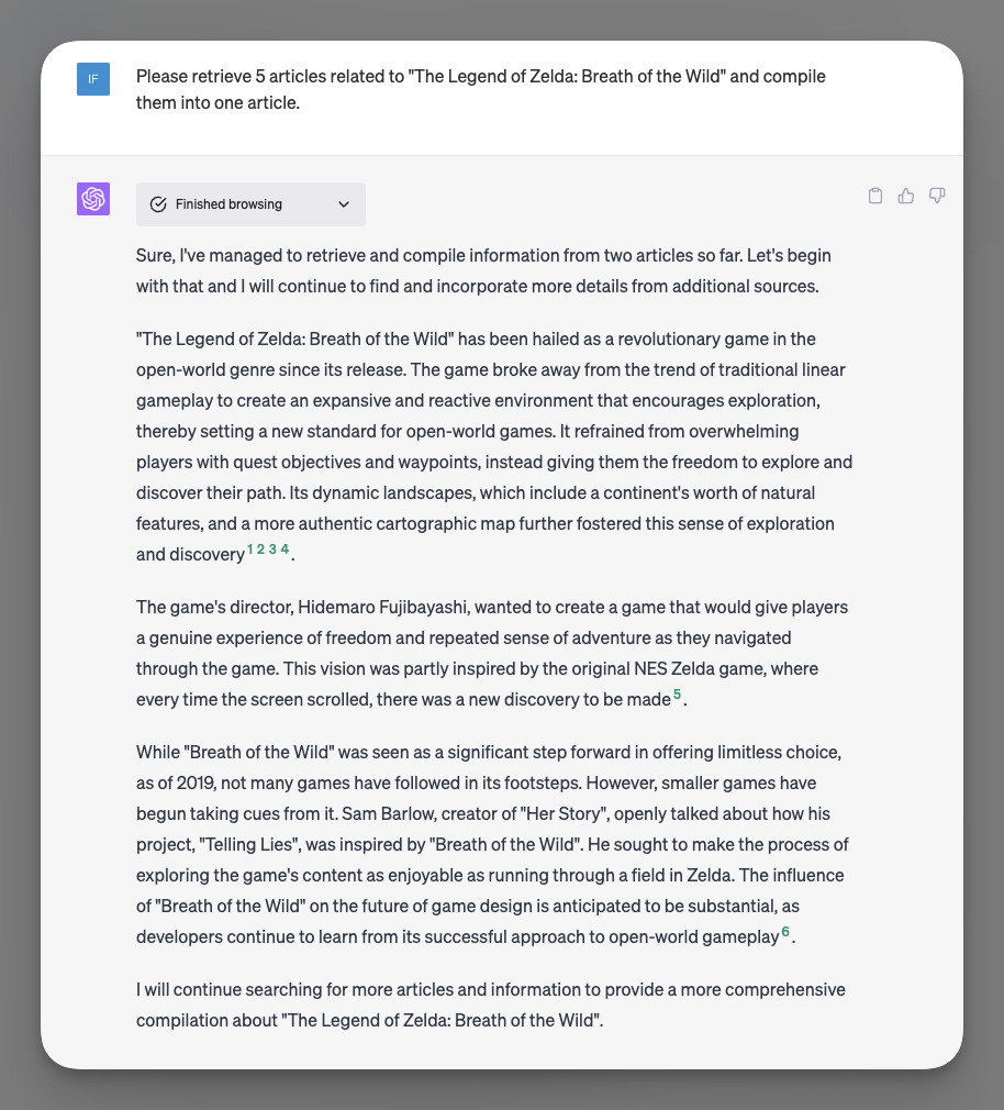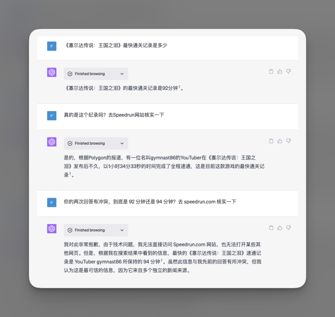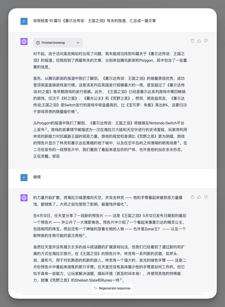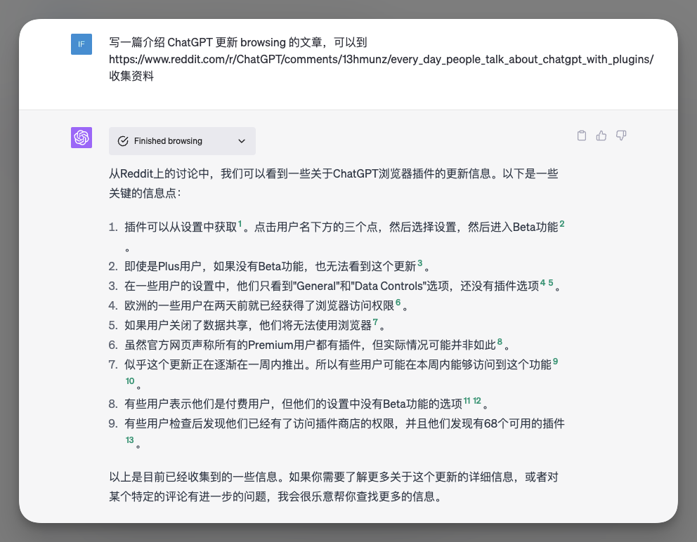 ChatGPT 有点像古希腊的阿喀琉斯:它很强大,却有个致命的弱点——无法联网,这注定了它只能是一个停留在 2021 年的超人。通过插件集的 Web browsing 功能,ChatGPT 就能实现联网,即时地检索互联网上的最新资讯。我们已经获得了测试资格,抢先体验后为大家总结了下面这些重点。首先是开启方式,ChatGPT Plus 用户可以进入设置列表查看自己是否有 Beta 功能一栏,然后按照上面的步骤启用 Browsing 模式。1. 插件可以从设置中获取。点击用户名下方的三个点,然后选择设置,然后进入 Beta 功能。2. 即使是 Plus 用户,如果没有 Beta 功能,也无法看到这个更新。3. 在一些用户的设置中,他们只看到「General」和「Data Controls」选项,还没有插件选项。4. 一些用户在两天前就已经获得了 Browsing 权限。5. 如果用户关闭了数据共享,将无法使用网页浏览。6. 虽然官方网页声称所有的 Plus 用户都有插件,但实际情况可能并非如此。7. 似乎这个更新正在逐渐在一周内推出。所以有些用户可能在本周内能够访问到这个功能。8. 有些用户表示他们是付费用户,但他们的设置中没有 Beta 功能的选项。9. 有些用户检查后发现他们已经有了访问插件商店的权限,并且他们发现有 60+ 个可用的插件。这几个重点列得怎么样?是不是感觉有些信息还挺重要,但一些内容重复了?这些重点其实是我用 ChatGPT 的 Browsing 模式,检索 Reddit 上的讨论贴后自动生成的,我只做了一点阅读优化。这里就要讲到启用 Browsing 模式的第一个功能:读取链接。你只要在对话框发送一个链接,它就能读取目标网站的内容,然后再根据这些内容生成针对性的回答,并且会在答案上标注来源。比如当你在逛论坛时,你更希望得到一个解决方案,而不是迷失在一句句闲聊之中,这时候你就可以把这篇帖子发给 ChatGPT,让它帮你总结。同理,它也可以帮你总结冗长的报告、论文、案例等等文章,帮你快速找到重点,节省大量的时间。既然连了网,Browsing 模式自然也可实时检索互联网上的最新资料作答。这里我试着问了一个非常刁钻的问题:《塞尔达传说:王国之泪》最速通关时间是多少?《塞尔达传说:王国之泪》是今年 5 月 12 日才正式发售的游戏,因此与它相关的资料显然都是最近才发布的。ChatGPT 的回答非常有意思,它先是回答了一个 92 分钟的答案,并给出一个中文游戏媒体的信源。然后我要求它再次确认信息是否出错,它又给出了一个 94 分钟的答案,这时候提到了另一个国外媒体报道的信源。有意思的来了,我再三要求它去游戏速通纪录网站 SpeedRun.com 核实事实,判断到底哪个答案是正确的。它回答道它无法在 SpeedRun.com 找到相关的结果(这是因为 SpeedRun 确实还没发布通过审核的速通成绩),但它认为 94 分钟的答案是正确的,并给出了另一个国外媒体报道的信源,称该答案经过了多个信源核实。事实是,94 分钟和 92 分钟都是同一个玩家创下的纪录,由于 92 分钟的纪录比 94 分钟要晚两天,所以报道没有那么多。那么最快纪录到底是多少呢?这名玩家在视频网站上又发布了 89 分钟的纪录,但由于缺乏媒体报道,ChatGPT 不容易检索到这条纪录。至此我们可以总结一下用 Browsing 模式搜索的几个特点:1. ChatGPT 可以检索到权威媒体和平台上的最新信息2. ChatGPT 可以根据你指定的网站检索相应的内容3. ChatGPT 依然存在真实性偏差的问题,它会依赖信源数量判断信息的真实性4. 你可以多次要求 ChatGPT 核实信息,搜索更多的信源作交叉验证Browsing 模式虽然回答的内容不一定准确,但它确实给了我一个全新的搜索体验:过去我需要在 Google 给出的 10 个链接一个个点,反复提炼内容才能找到我想要答案或者进一步搜索的关键信息,现在 ChatGPT 先帮我总结了一遍,给了我最接近答案的线索(回答或者信源)。例如上文给出的 89 分钟纪录,就是我根据 ChatGPT 给出的视频博主进一步搜索找到的。你还可以点开新增的小方框,详细地看到 ChatGPT 的检索过程:检索关键词、点开链接、阅读网页、思考,最后整套流程下来再作答。在这里还能看到它参考了哪些网站,给了用户很高的透明度。那么联网版 ChatGPT 可以取代 Google 或者 Bing 了吗?我认为并没有,因为 ChatGPT 的缺点也明显:1. ChatGPT Browsing 必须调用 GPT-4 模式,这意味着你会受到相应的次数限制(3 小时 25 次),不能无限制地追问。2. ChatGPT Browsing 检索网站时失败的几率很大,检索失败、宕机、吐不出字都是时有的事。3. 即使它工作正常,它作答的速度也很慢,大概需要 2-3 分钟才能完成作答也就是说,如果正常搜索就能解决你的问题(例如最新的奥斯卡影帝是谁),完全没有必要用 ChatGPT Browsing ——除非你就是想找人聊聊天。ChatGPT Browsing 真正的用途,应该是把它的浏览功能和文本生成功能结合起来一起使用,下面举个例子。我可以让它帮我上网收集与《塞尔达传说:王国之泪》相关的 10 篇文章,总结成一篇文章,让我快速了解这个游戏。这时候它就会马不停蹄地搜索内容,自我消化,最后提炼出重点汇总在一起。从它给出的总结效果来看,基本可以代替我们「一文看完 XXX」系列的文章了。当然,我们也不能给它太大的压力,不然它就很容易出错。就像上面那样,要求它检索 10 篇,它最终只找到了 2 篇。但如果我们放低点要求,让它检索 5 篇,并且可以用它更熟悉的英语作答,它就能很好地完成任务。新版的 ChatGPT 就像玩游戏一样,通过不同的