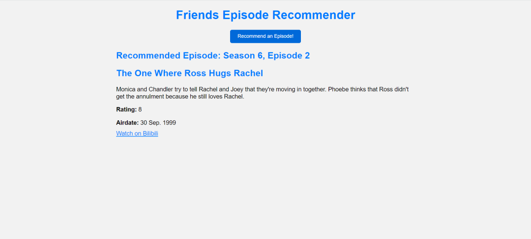 3.首先我们先看一眼我做的老友记随机选集器到底是一个什么东西,现在大家看到的就是随机选机器打开之后的样子,上面首先有一个标题,标题下边是一个按钮,上面写着赶紧给我推荐一集,然后点击之后就出现了推荐的具体的集数,可以看到这推荐的是第七季的第四集。