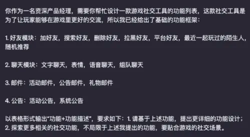 这篇文章会聚焦在产品层级,让我们一起看看GPT是如何做到帮我们梳理功能模块的。以“设计一个游戏内社交工具”为需求,让GPT帮助我们完成这份产品的功能模块梳理。