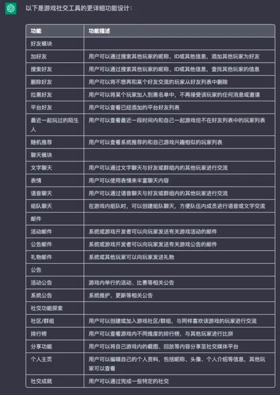 这样,我们就初步获得了一个游戏内社交工具需要的功能框架。接下来,我们就可以根据每一个一级功能模块(例如上图里的好友、聊天等),让GPT针对性的设计更详细的子功能。