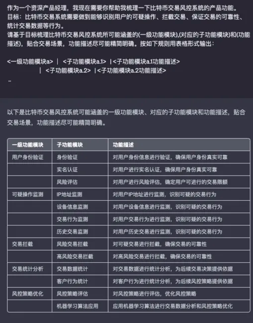 可以看到如果是一句话描述产品功能需求,gpt给出的功能文档虽然覆盖了较多功能,但是内容都比较通用,可能未考虑一些特殊场景