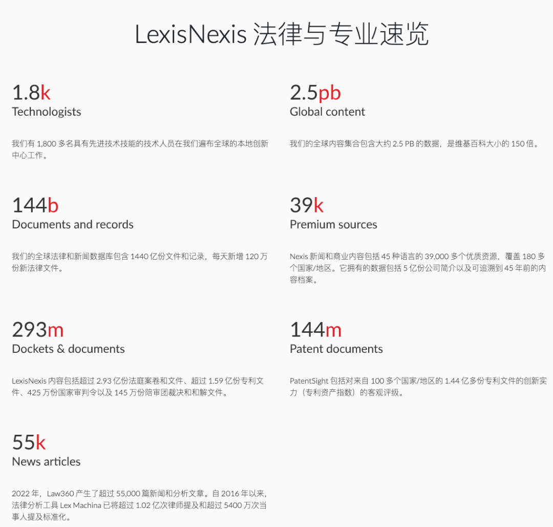 这个从1980年就开始从事法律研究服务的老牌公司,有着超过160个国家、100多万律师和律所的资源,2.93亿份卷宗、1.59亿专利文件、425万份审判书等等海量数据。