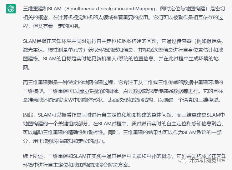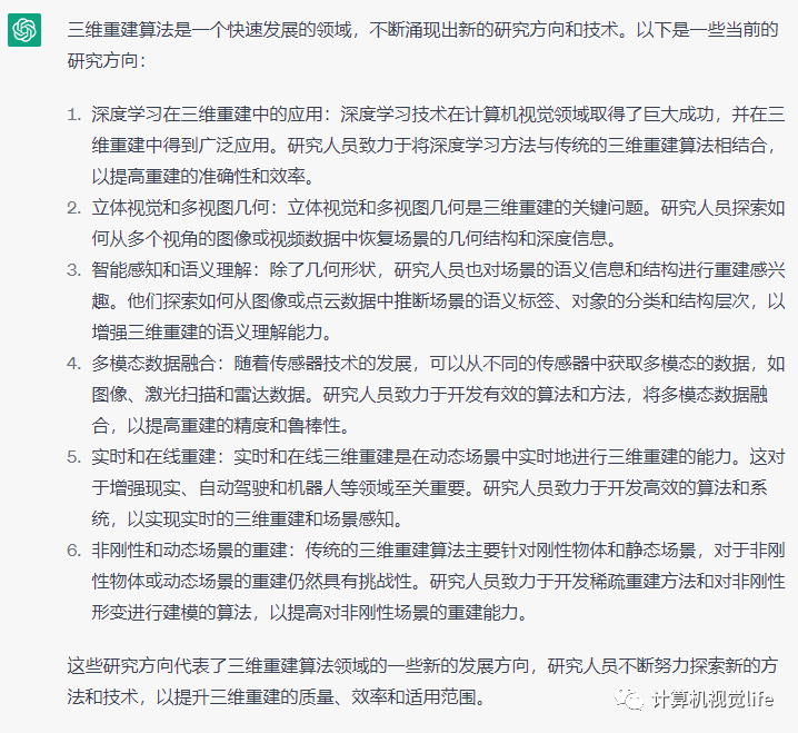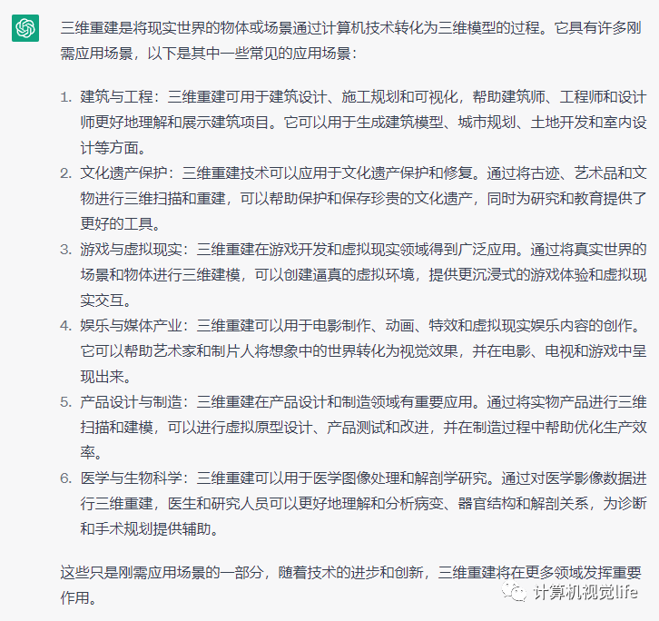 我们平台发布过多个三维重建相关的技术文章和教程,那么在chatGPT眼里,它是如何看待三维重建的呢?