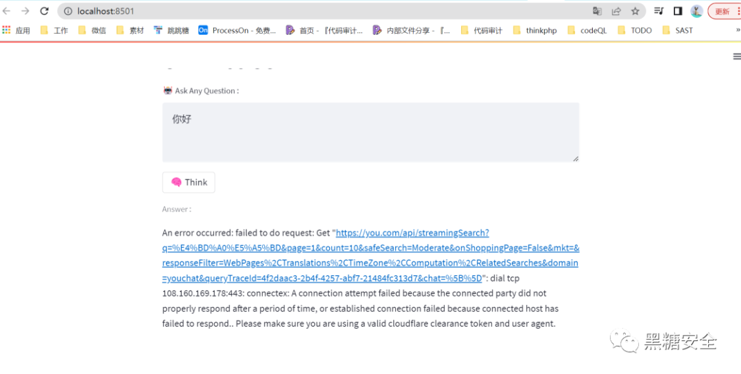 An error occurred: failed to do request: Get "https://you.com/api/streamingSearch?q=%E4%BD%A0%E5%A5%BD&page=1&count=10&safeSearch=Moderate&onShoppingPage=False&mkt=&responseFilter=WebPages%2CTranslations%2CTimeZone%2CComputation%2CRelatedSearches&domain=youchat&queryTraceId=4f2daac3-2b4f-4257-abf7-21484fc313d7&chat=%5B%5D": dial tcp 108.160.169.178:443: connectex: A connection attempt failed because the connected party did not properly respond after a period of time, or established connection failed because connected host has failed to respond.. Please make sure you are using a valid cloudflare clearance token and user agent.