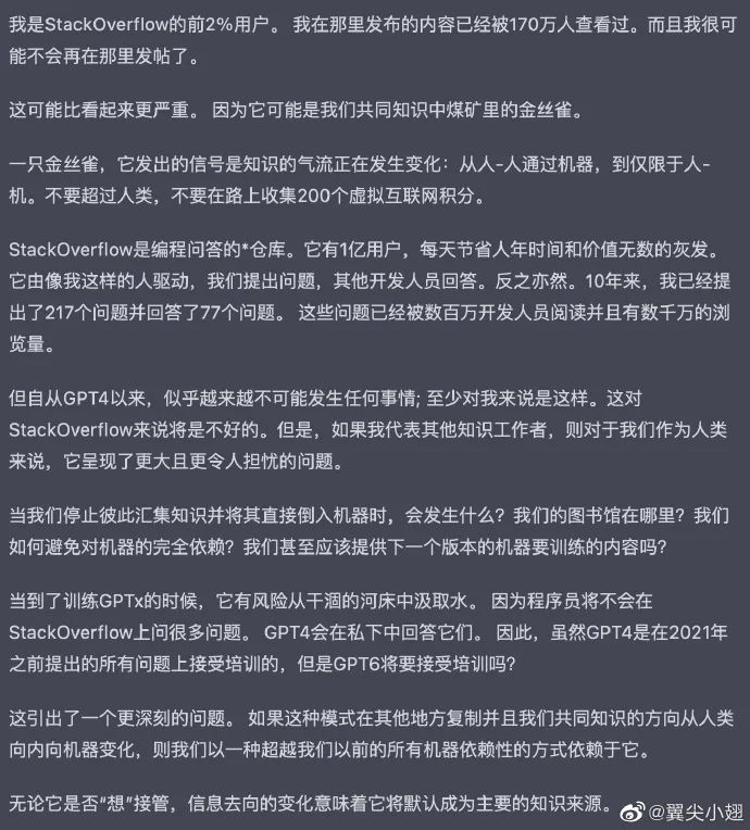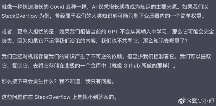 想一想,如果未来我们都使用生成式 AI 进行辅助人类工作,我们都把问题和知识灌给了 AI ,我们也从 AI 那里获取知识,以后其他平台上是不是就没有内容了?知识全被这个 AI 给吞掉了。