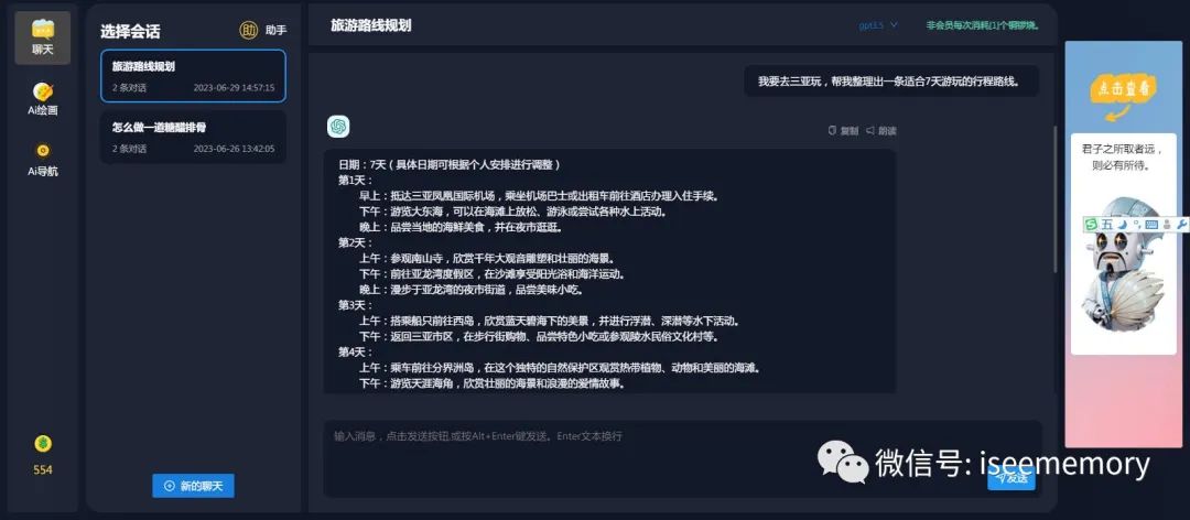 我用它帮我生成了一个去三亚玩的旅游攻略,一个从来没去过三亚的人,很想知道哪里好玩。