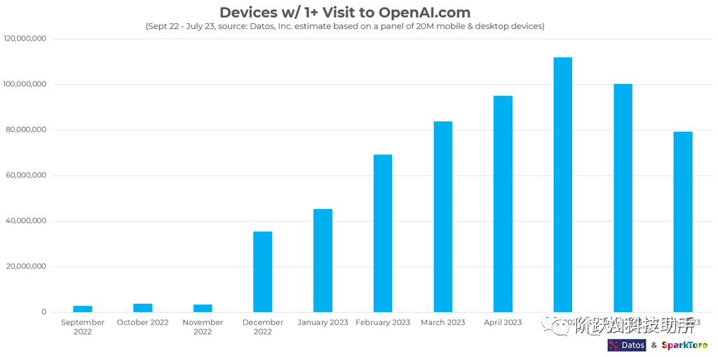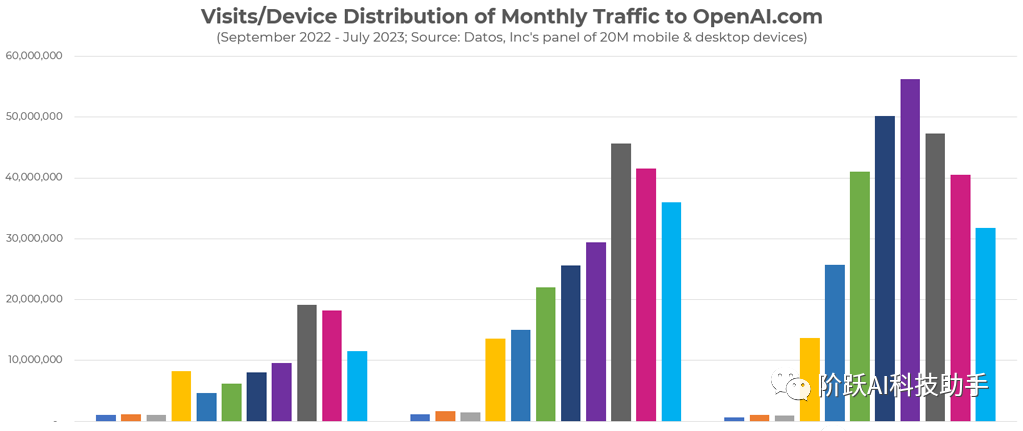 虽然市场对AI应用的需求仍在不断增长,但各项数据显示,自5月份以来,直接访问OpenAI官网的流量一直在下降。根据Similarweb的统计,到7月份,流量下降了21%。而最新的Datos统计显示,下降幅度达到了29%。需要指出的是,这些数据仅涵盖了openai.com官网的流量,未考虑通过API接入的第三方和移动端数据。"