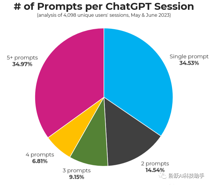 "针对第二个假设,Datos进行了一项详尽的数据研究,涵盖了7000多位真实ChatGPT用户的信息。在筛除了一些不可靠数据后,我们得到了4098个最为可信的用户数据。有关他们在使用提示(prompt)时的行为,下图显示了这一数据的分布情况。在这些用户中,使用5个或更多提示的占了一部分,而仅使用1个提示的用户也占据了约70%的比例。"